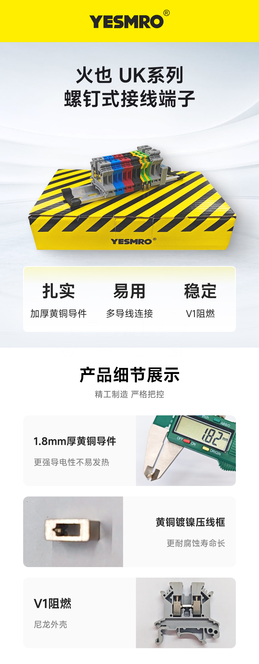 扎实:加厚黄铜导件,柔韧卡脚不易断 易用:支持单接线点多导线连接,无需预处理 稳定:V1阻燃尼龙外壳,H59黄铜镀镍耐腐蚀压线框
