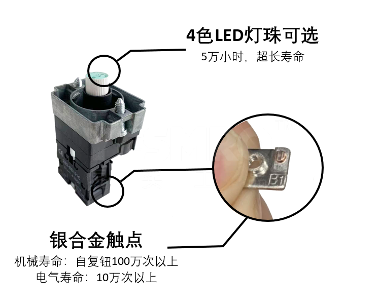 扎实:百万次按压,超长机械寿命 易用:模块化设计,多种触点组合 稳定:银合金触点,V2阻燃触点模块