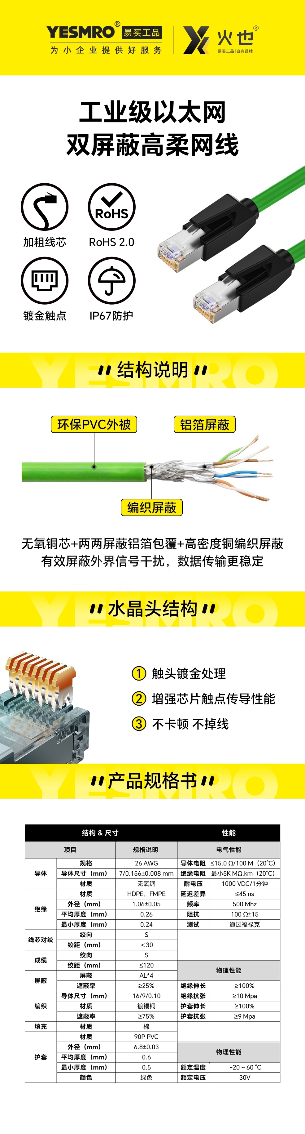扎实:纤芯采用26AWG加粗8芯无氧铜,触头工业级镀金 易用:对绞独立的双层屏蔽设计,强力隔绝外部电磁干扰 稳定:通过专业福禄克通断测试,IP67,符合CE,RoHS