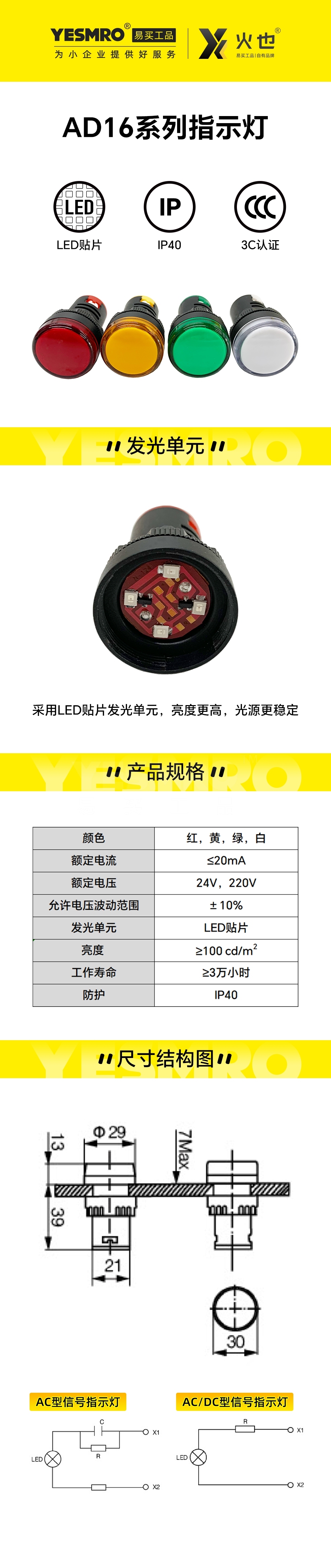 扎实:30000小时LED灯珠,低耗节能 易用:4色易辨识接线口,更省心、 稳定:IP40防护等级,带3C和CE认证