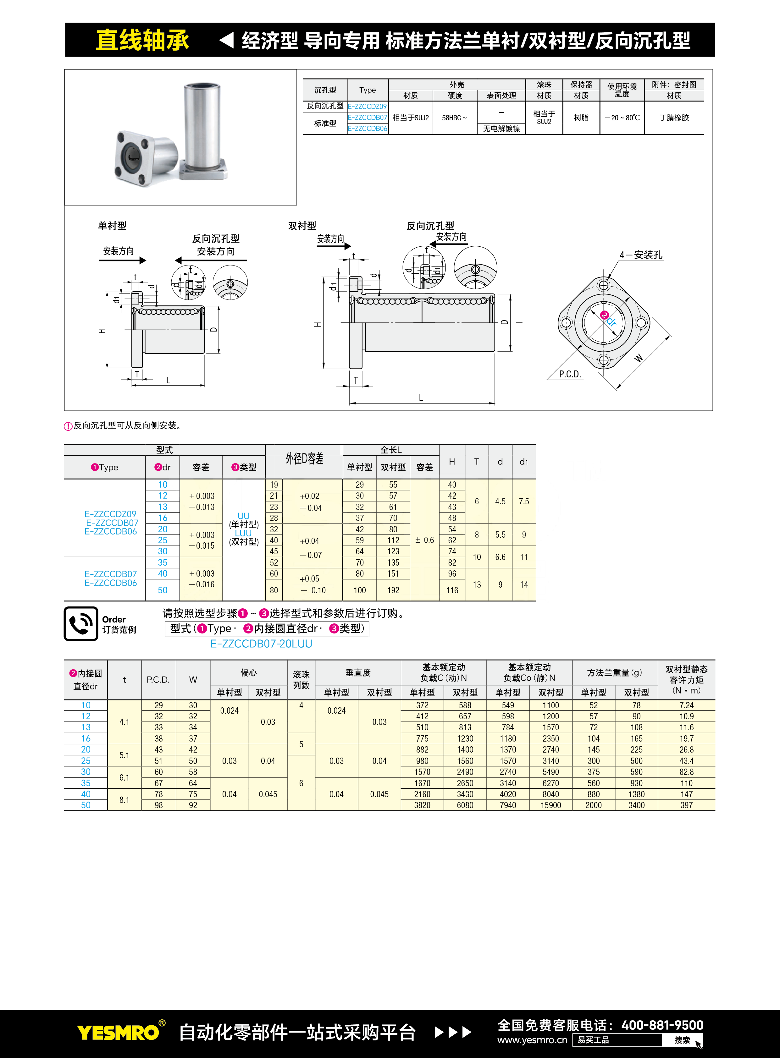 经济型 导向专用 直线轴承 标准方法兰 单衬/双衬型/反向沉孔型