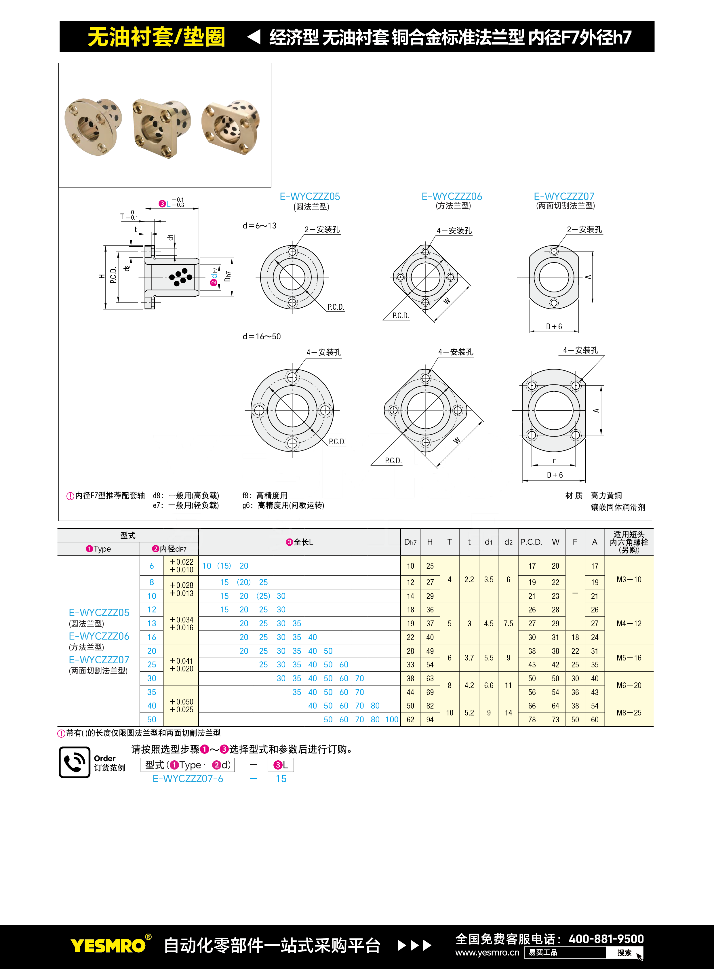 经济型 无油衬套 铜合金标准法兰型 内径F7外径h7