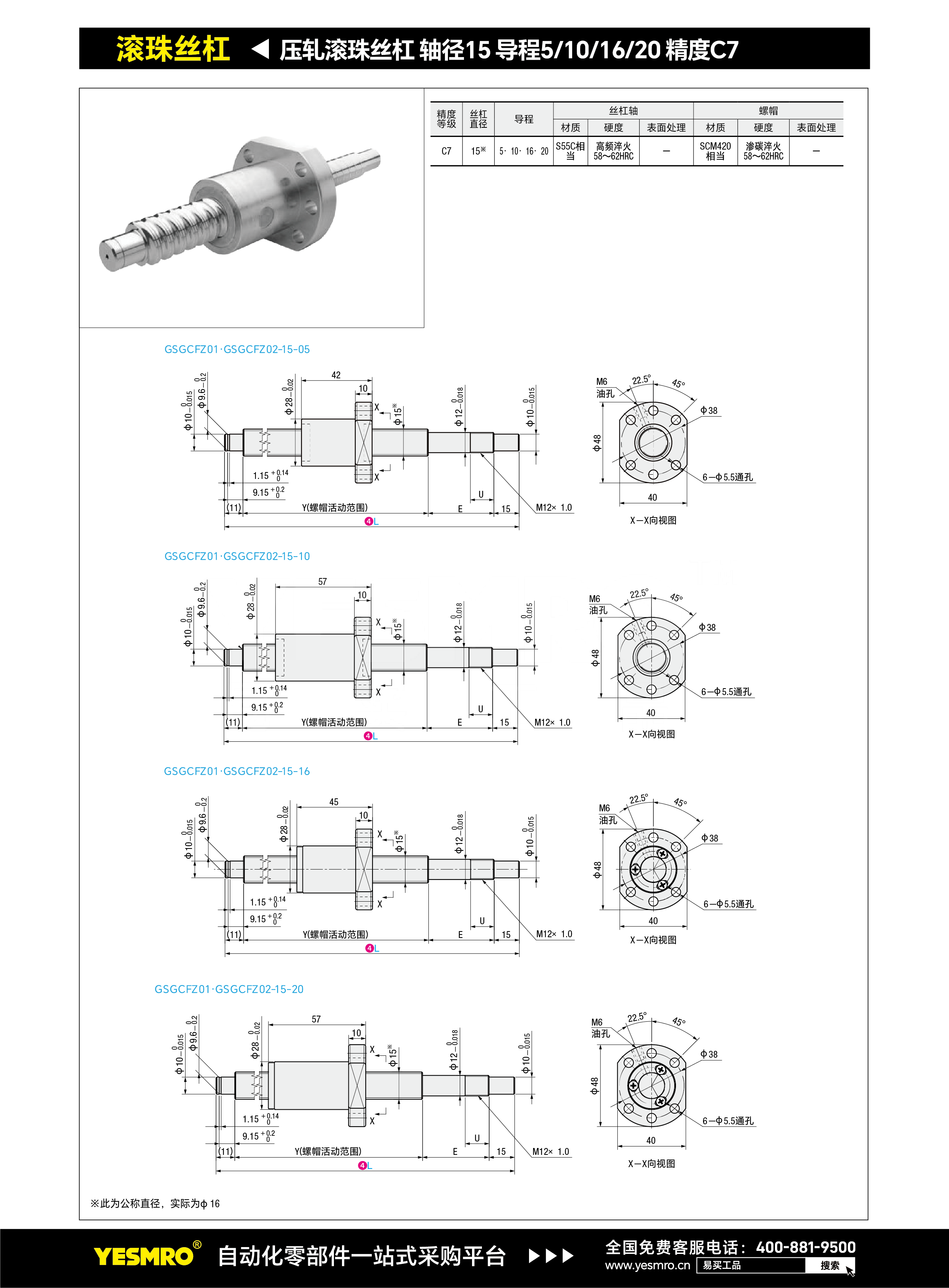 压轧滚珠丝杠 轴径15 导程5/10/16/20 精度C7