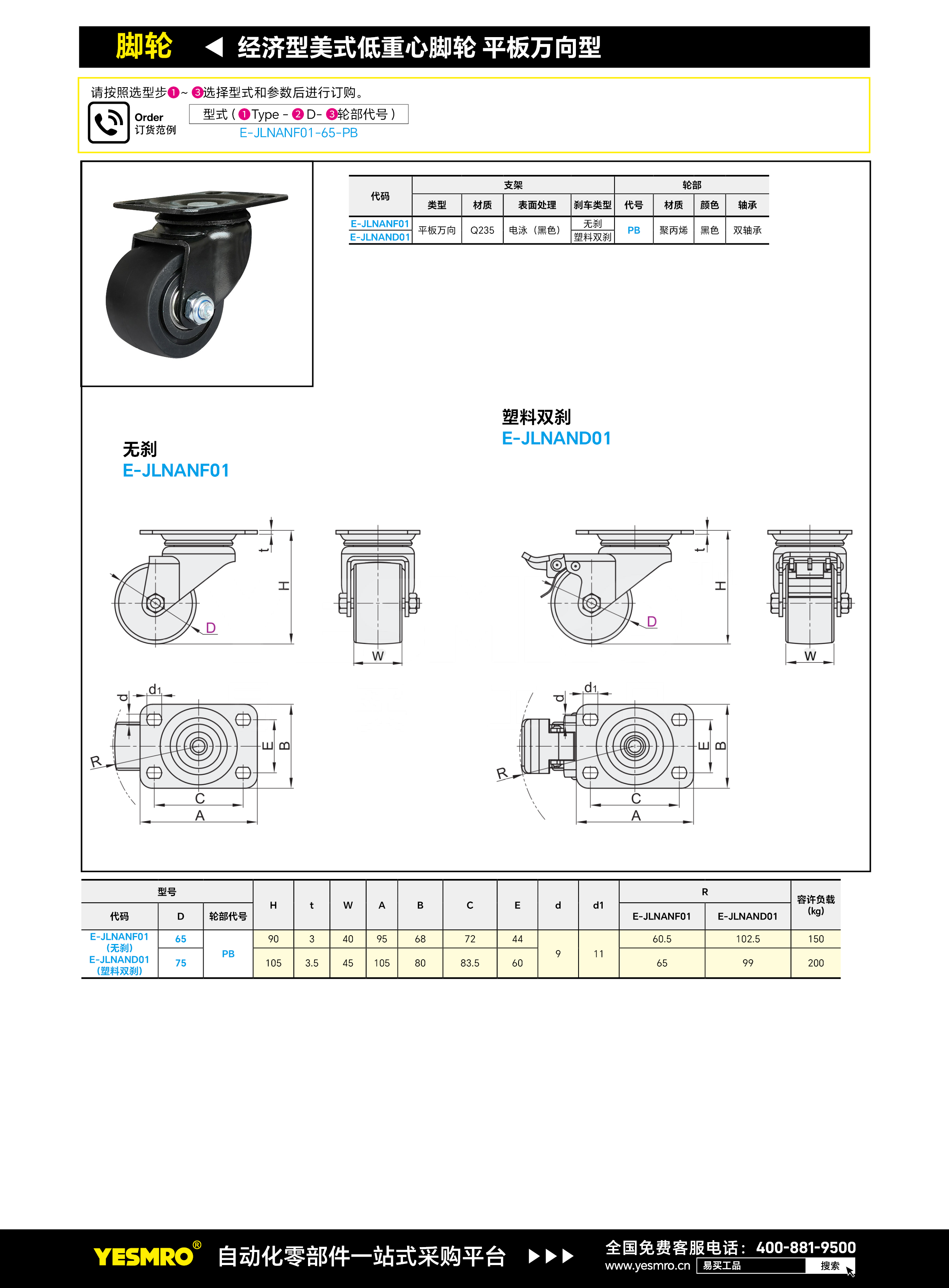 经济型 美式低重心脚轮 平板万向型 负载≤200KG