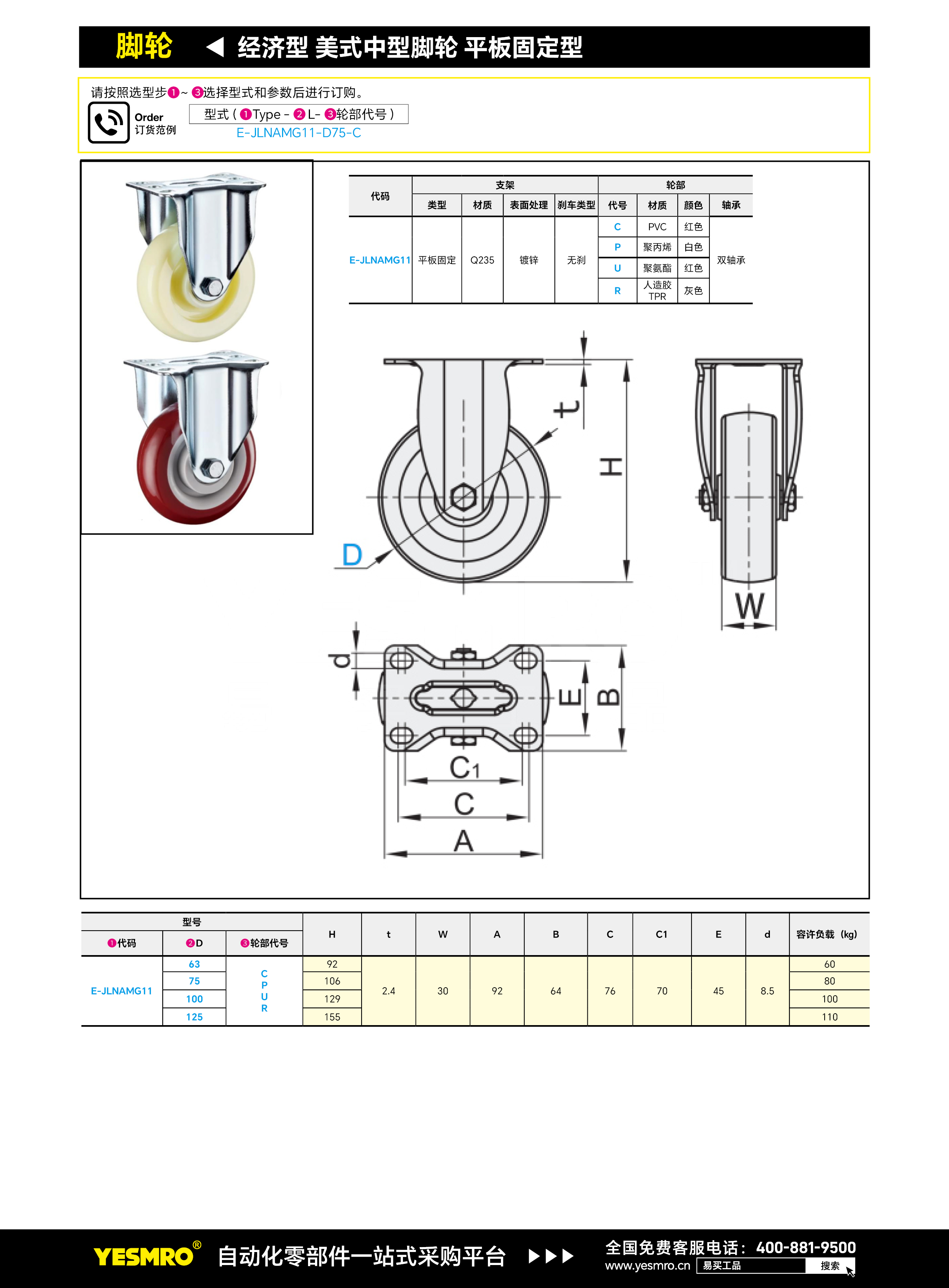 经济型 美式中型脚轮 平板固定型 负载≤110KG