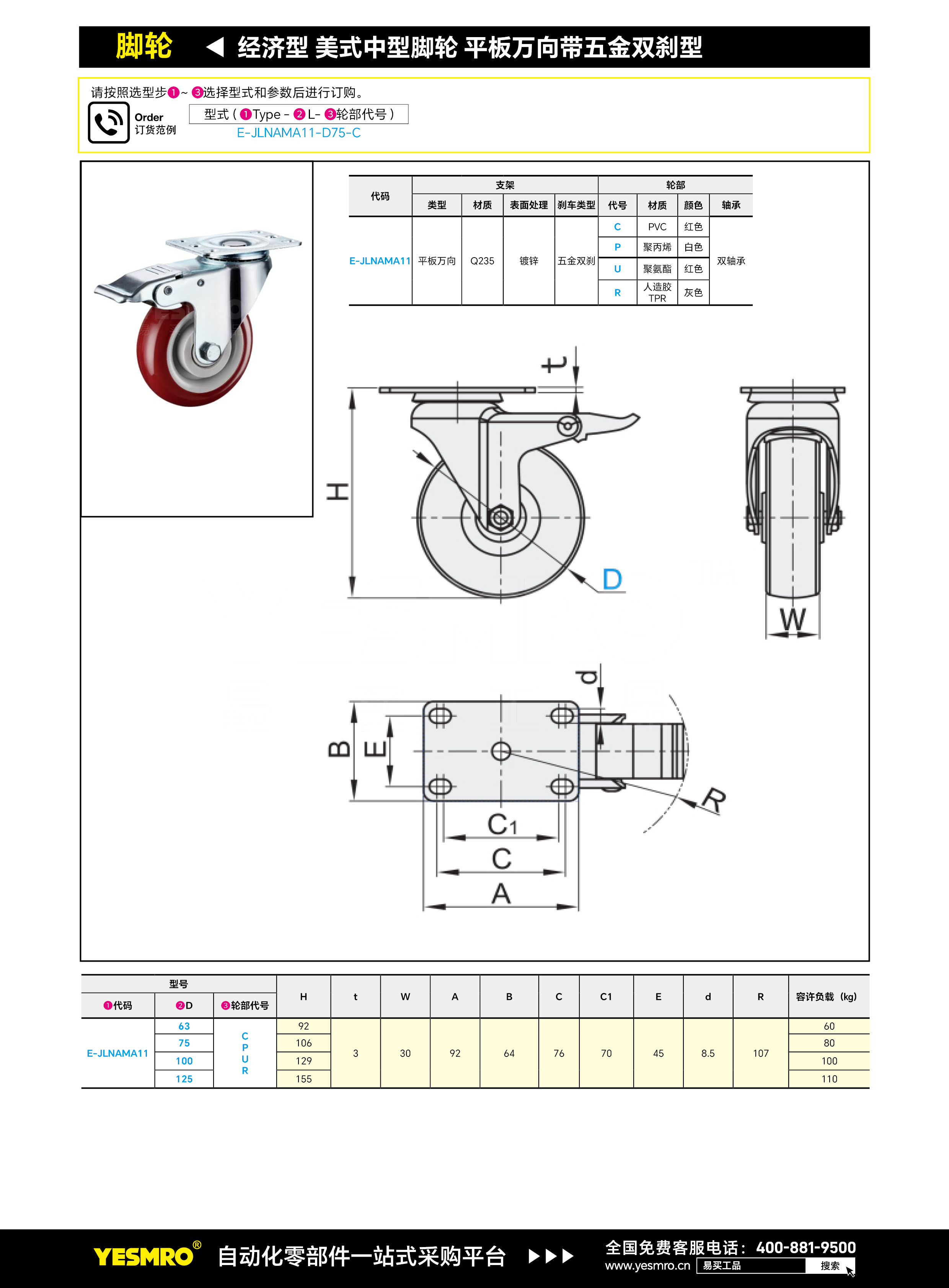 经济型 美式中型脚轮 平板万向带五金双刹型 负载≤110KG
