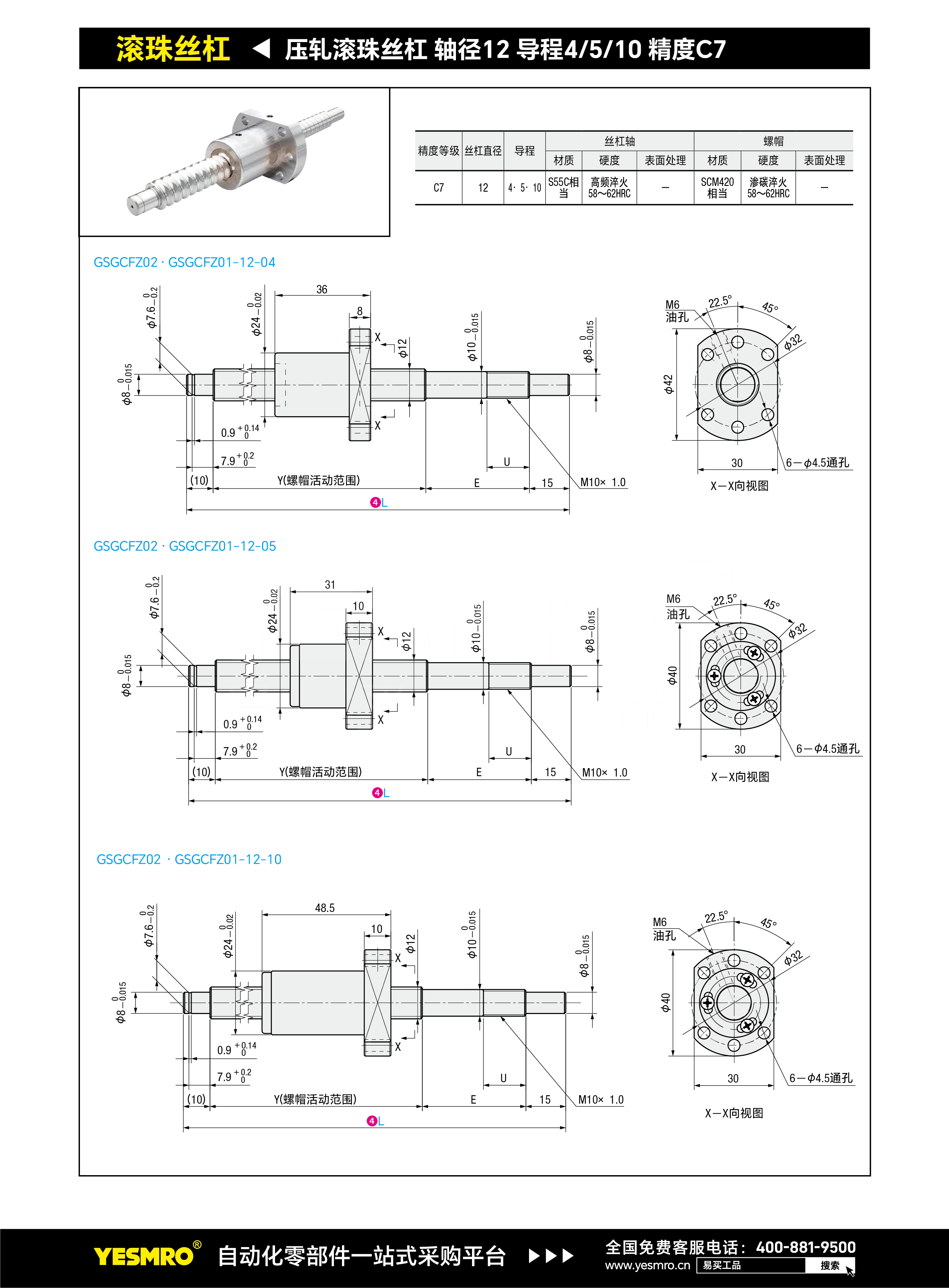 压轧滚珠丝杠 轴径12 导程4/5/10 精度C7