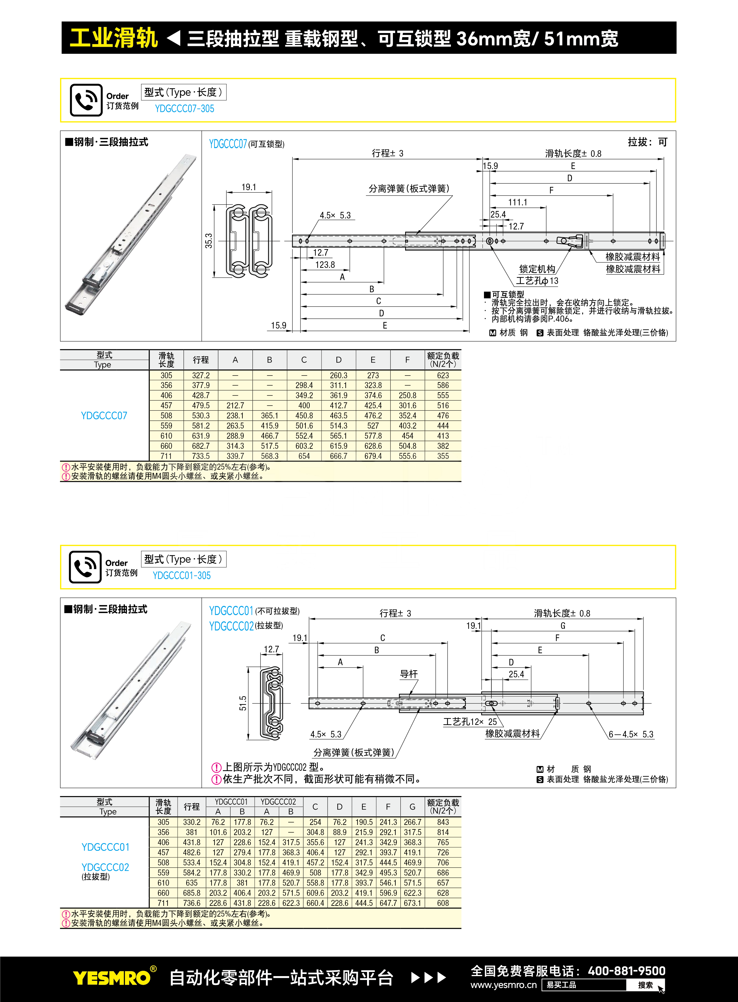 工业滑轨 三段抽拉型 重载钢型 51mm宽