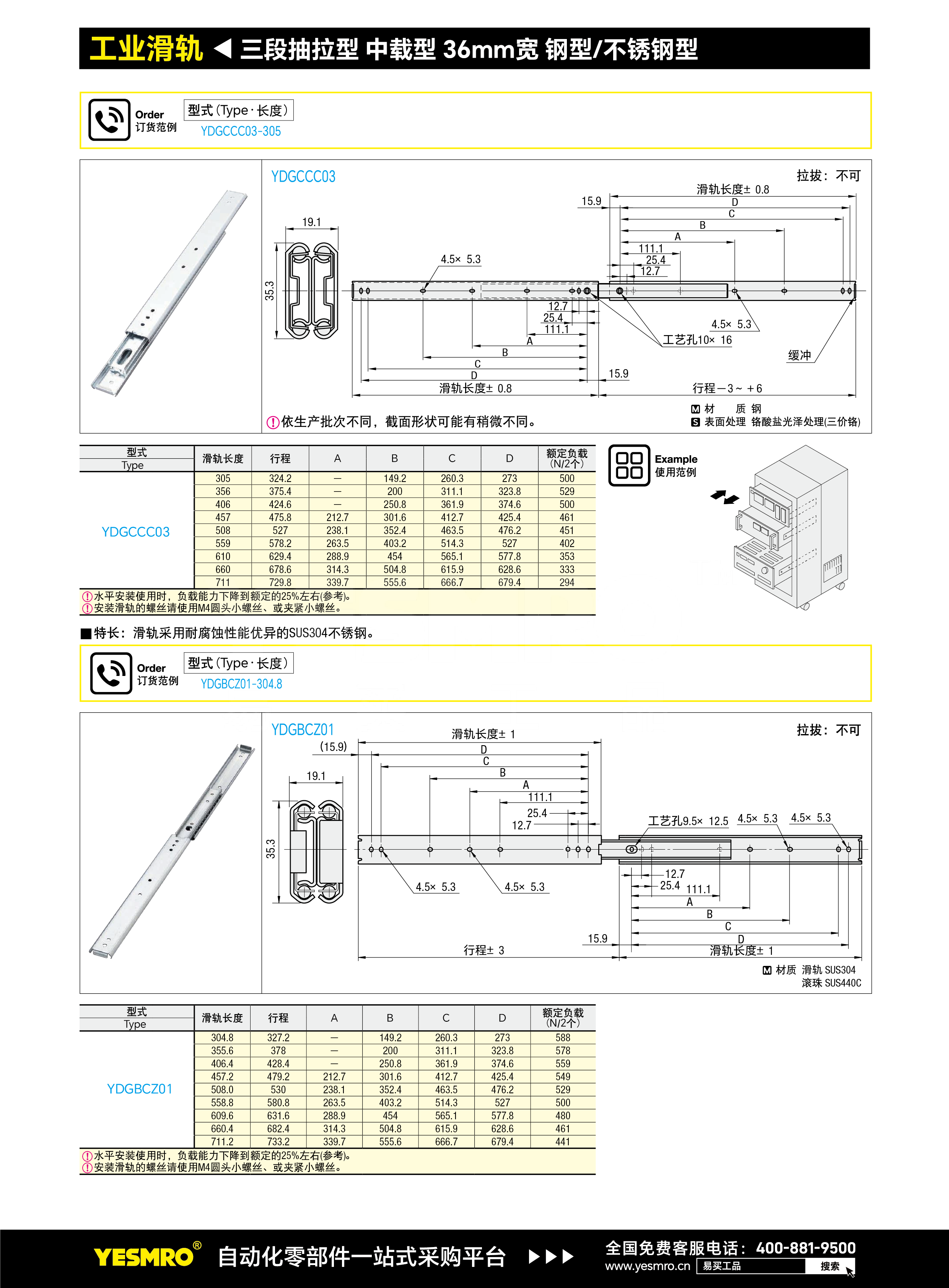 工业滑轨 三段抽拉型 中载型 36mm宽 钢型