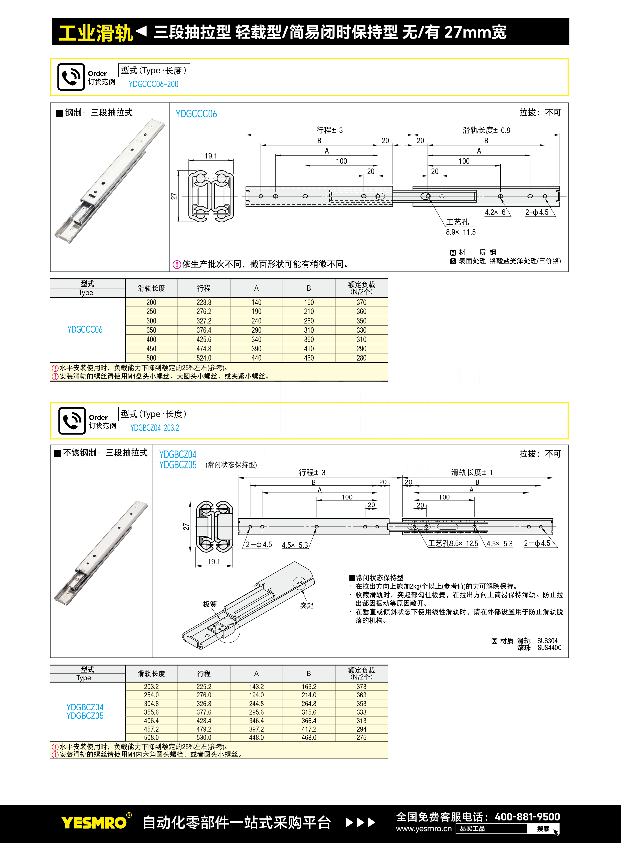 工业滑轨 三段抽拉型 轻载型 27mm宽 钢型