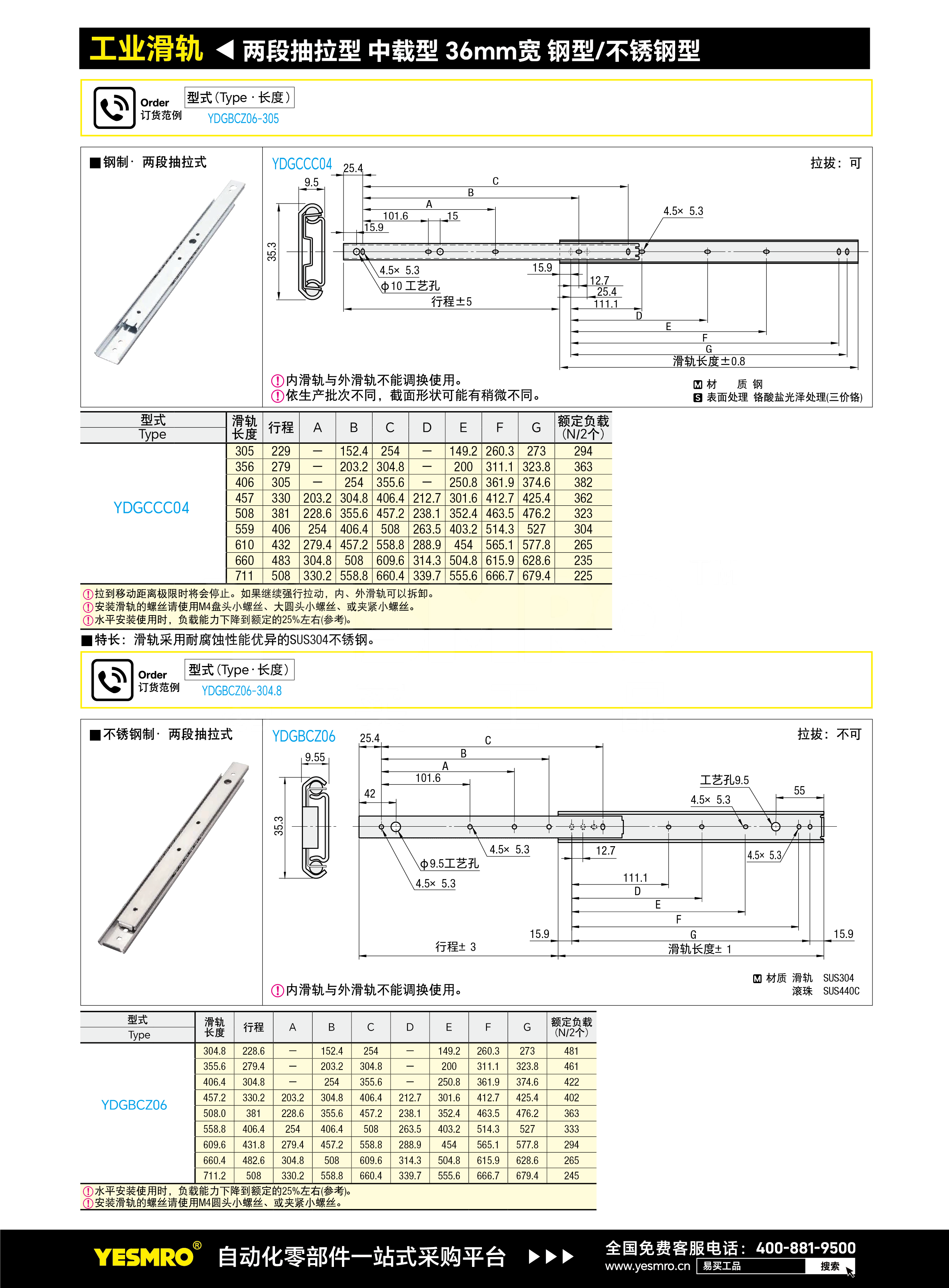 工业滑轨 两段抽拉型 中载型 36mm宽 不锈钢型