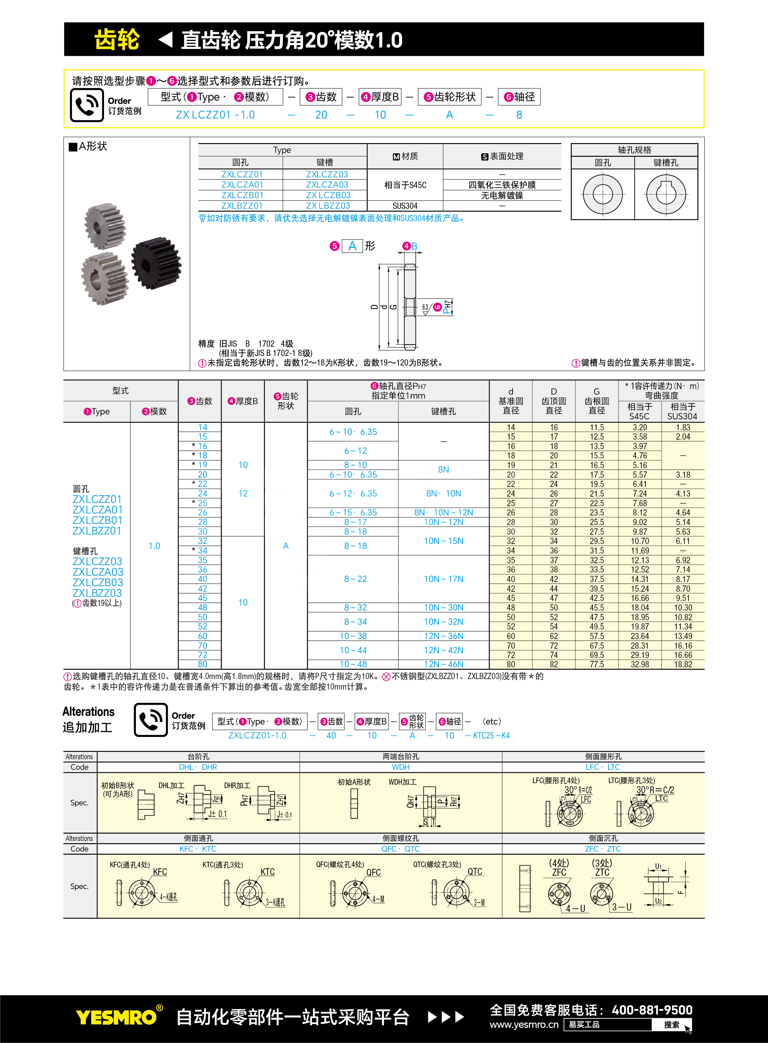 直齿轮 压力角20°模数1.0 指定型