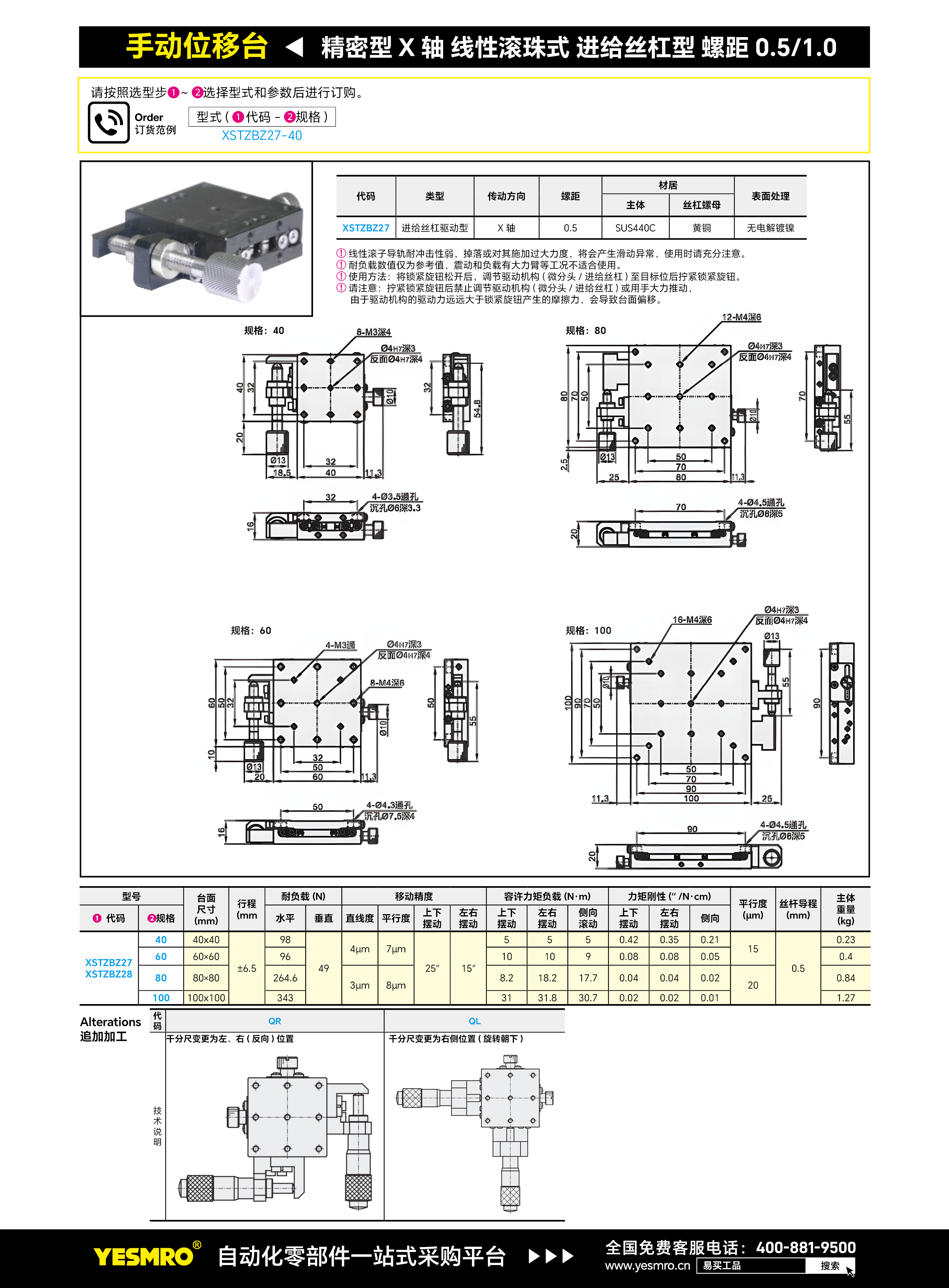 精密型 X轴 手动位移台 线性滚珠式 进给丝杠型 螺距0.5/1.0