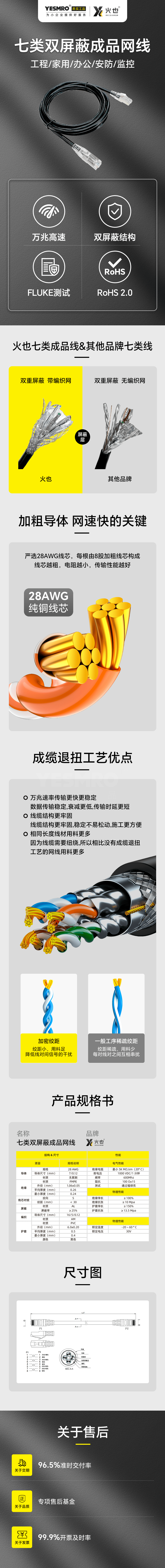 扎实:线芯采用28AWG 7/0.12 无氧铜,触头工业级镀金 易用:双对绞线屏蔽层,带金属编制网,万兆传输更方便 稳定:通过专业福禄克通断测试,符合CE,RoHS