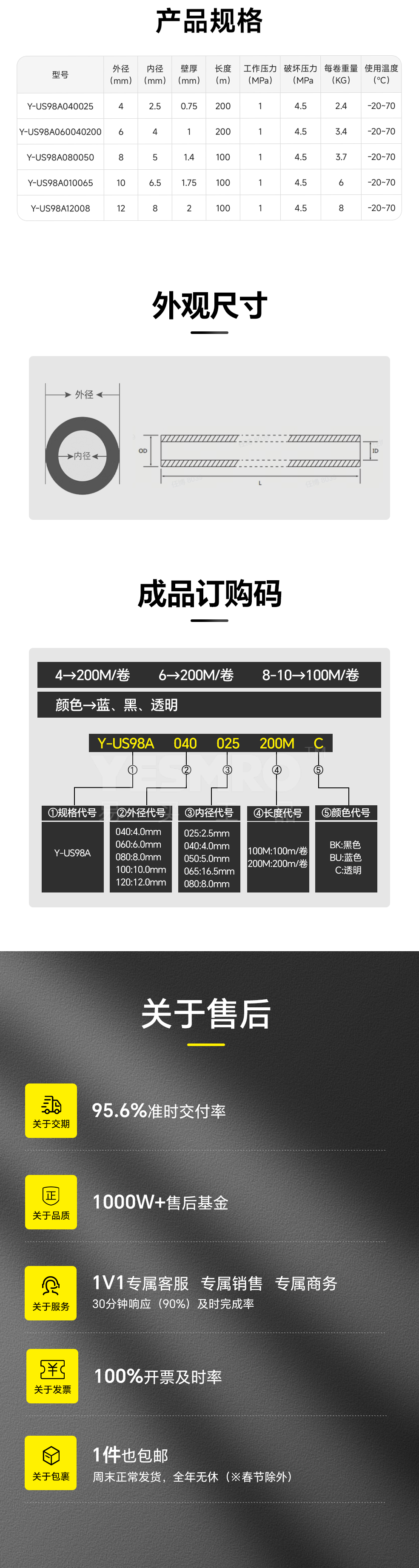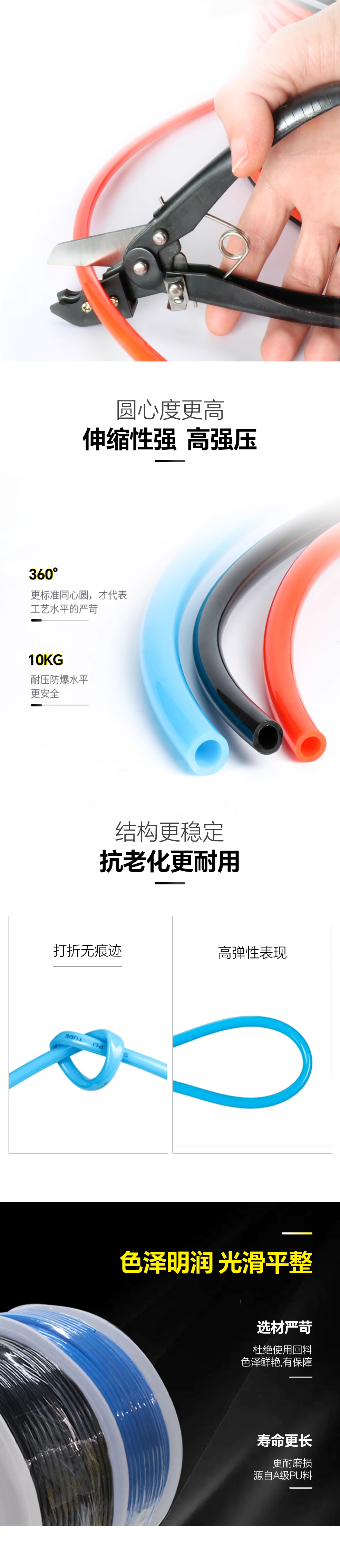 环保材质——可塑性聚氨酯,ROHS认证 高弹耐磨——用料扎实,弯折无痕 耐压防爆——额定耐压10KG,最大可达45KG 杜绝堵塞——产线24小时三维自动检测